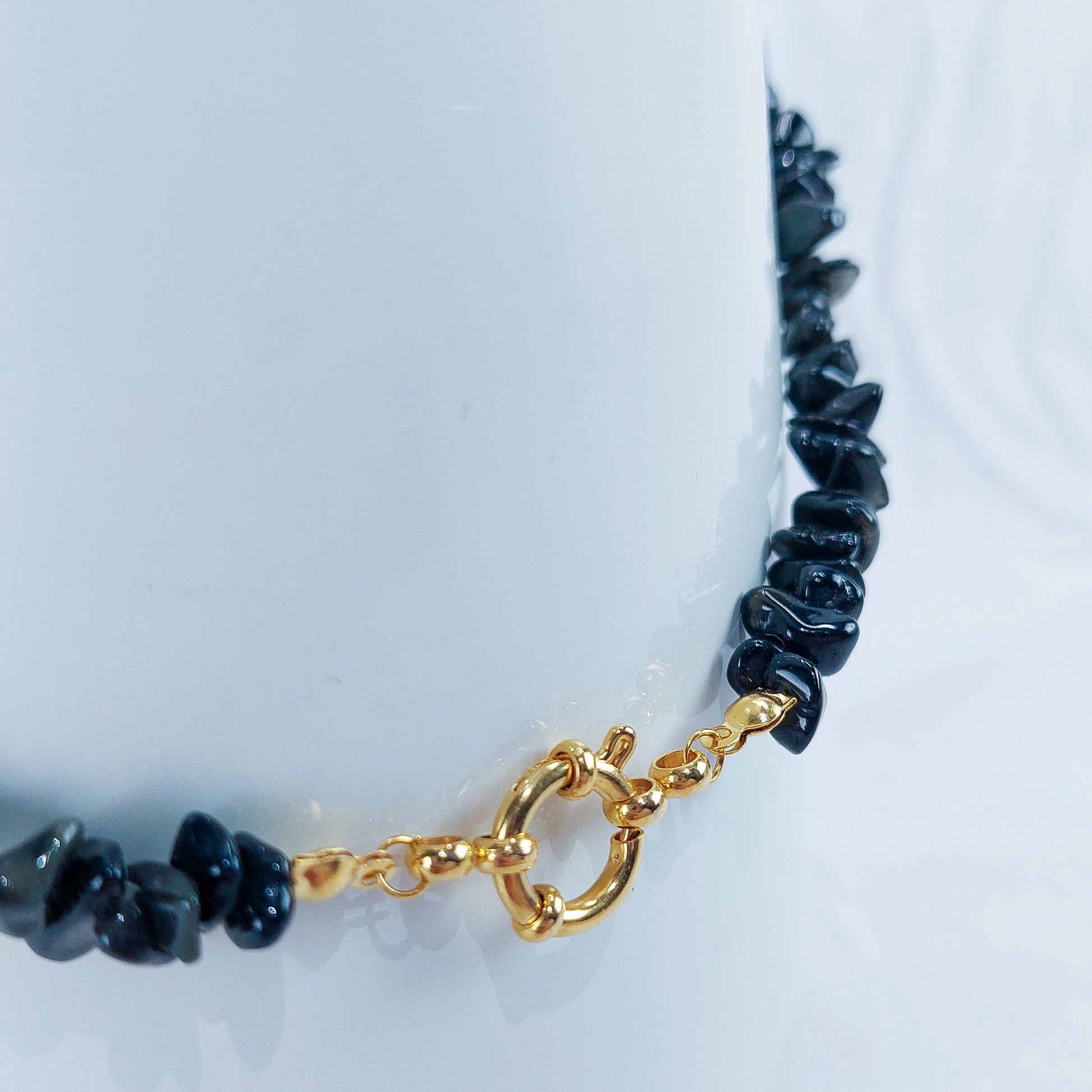 - Material: Chips de obsidiana natural e aço inoxidável dourado