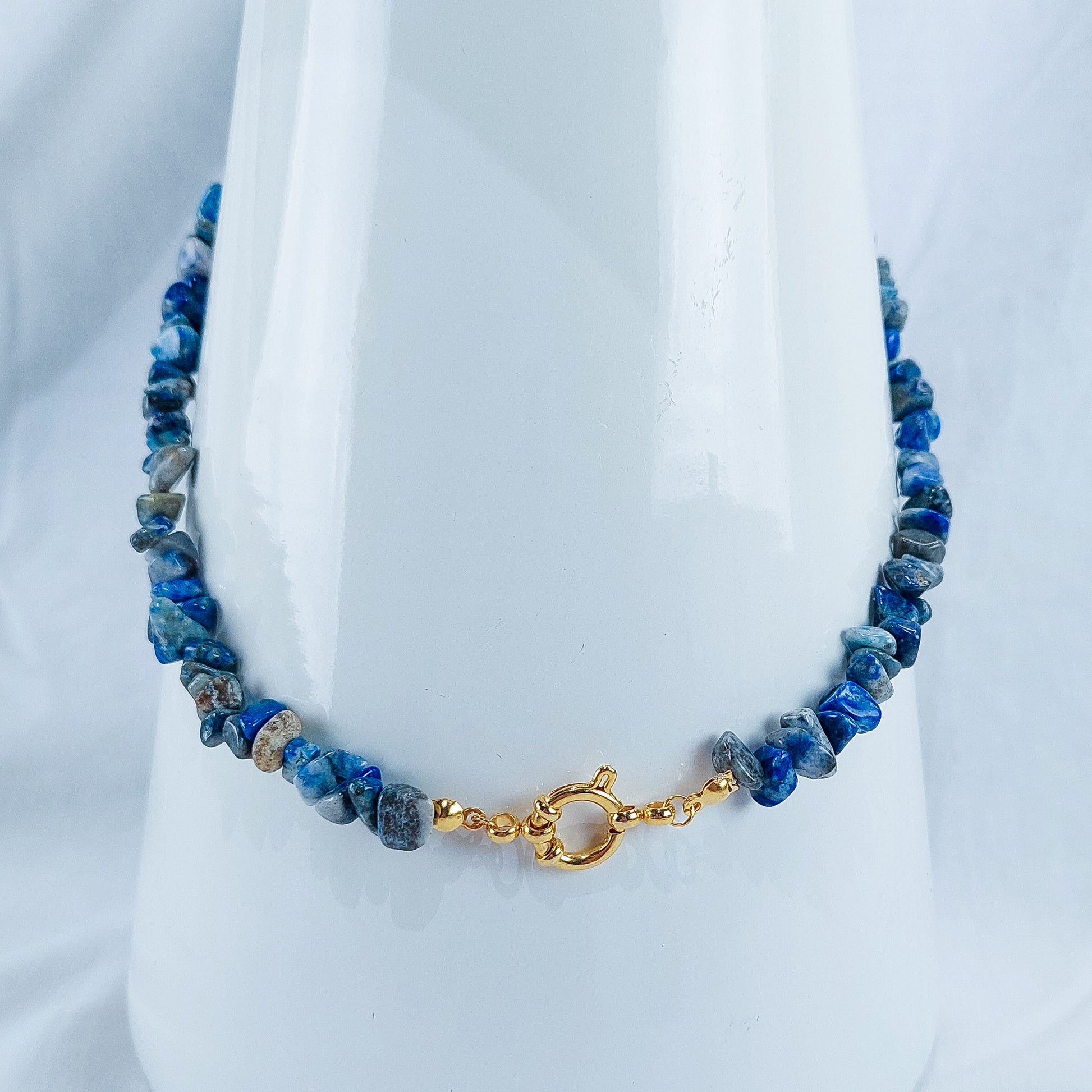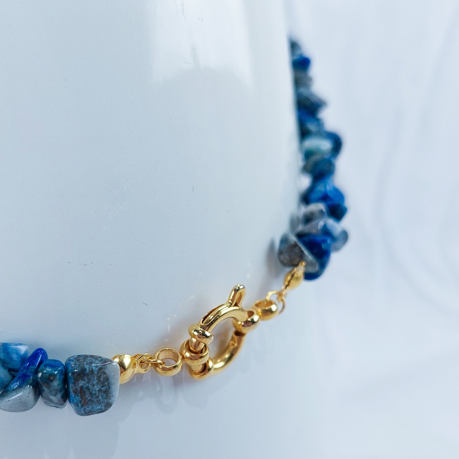 - Material: Chips de sodalite natural e aço inoxidável dourado